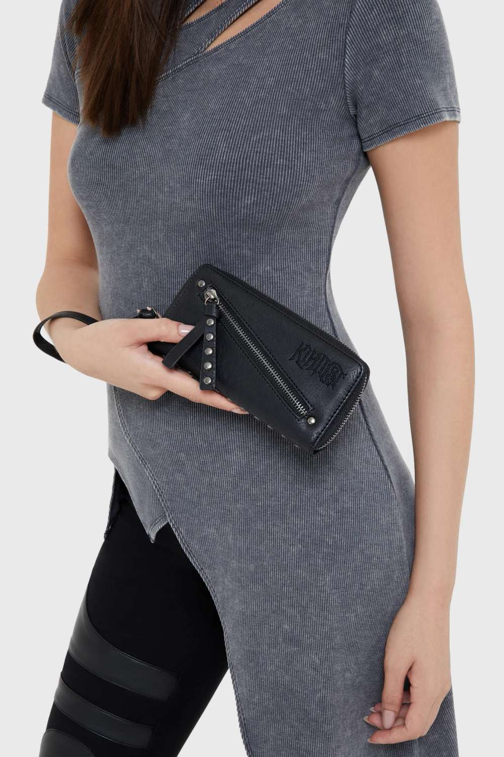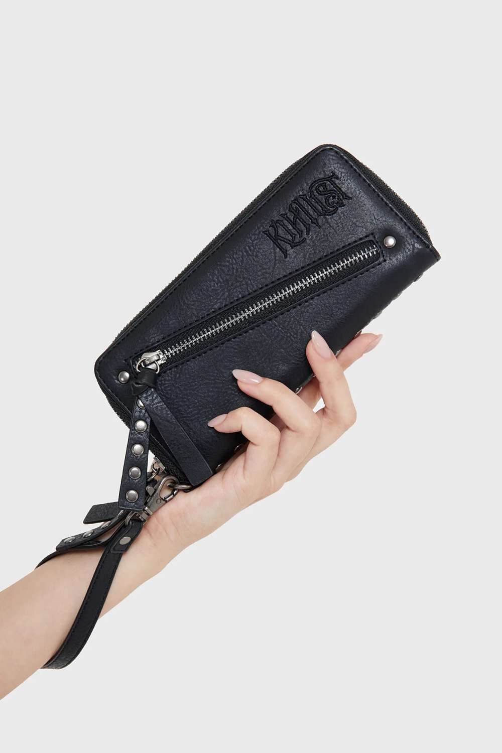 Die KIHILIST – Wastemire Wallet ist eine kompakte, gut organisierte Geldbörse mit markanten Gothic‑Details wie geprägtem Branding und verziertem Handgelenkriemen.