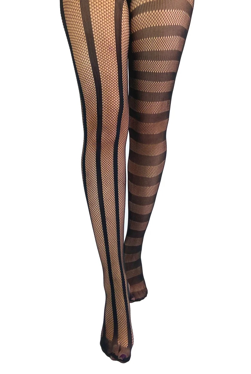The Opposite Net Tights from Pamela Mann add a unique, alternative twist to any gothic outfit. The fine mesh design is an absolute eye-catcher thanks to the asymmetrical pattern of vertical and horizontal stripes. Thanks to the elastic high-waist band and flexible material, the tights are comfortable and flattering. Reinforced toes ensure additional durability despite the completely transparent look. A must-have basic for anyone who wants to enhance their lookbook with a striking statement.