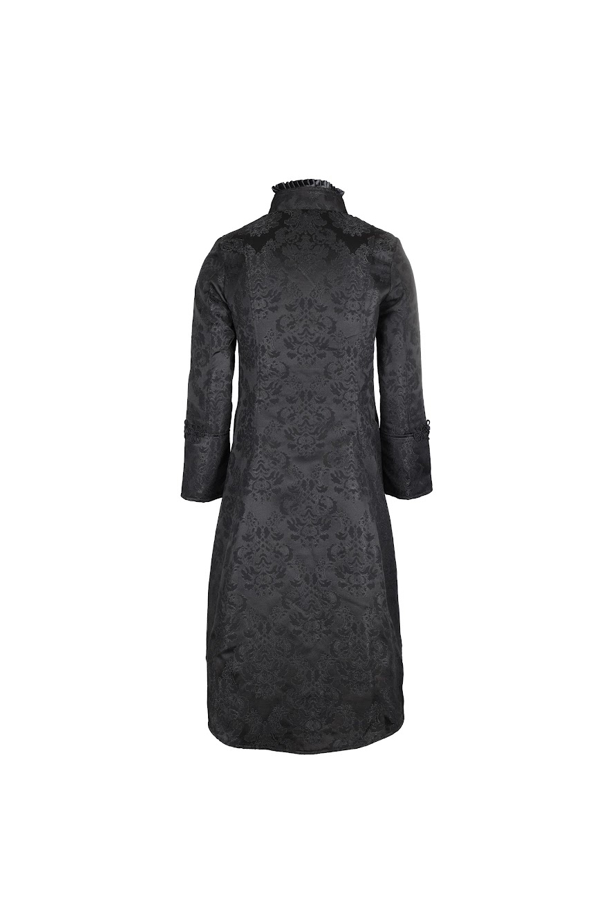 Das detailreiche Brokatmuster verleiht dem Stoff eine luxuriöse Ausstrahlung, während der Stehkragen mit feinen Rüschen eine romantische Note setzt.