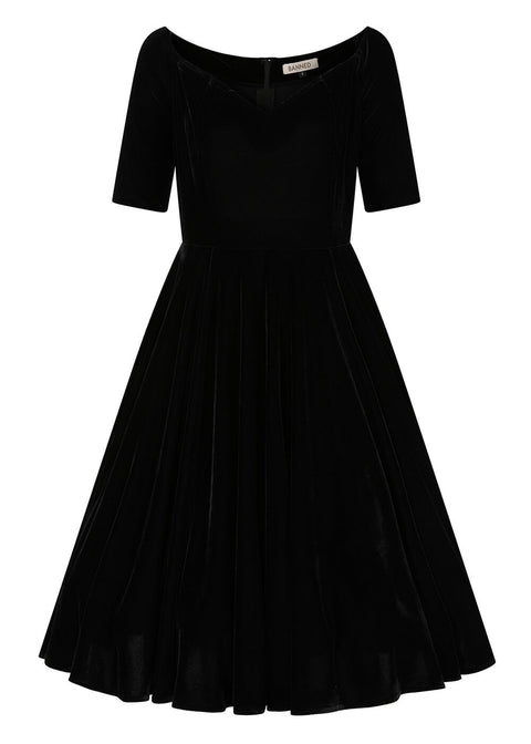 Das Banned Retro Amalia Velvet 50’s Swing Kleid in Schwarz ist ein elegantes, retro‑inspiriertes Kleid im Stil der 50er Jahre mit samtigem, dehnbarem Material, das angenehm zu tragen ist und zugleich einen luxuriösen Look erzeugt. Es hat einen herzförmigen V‑Ausschnitt mit off‑shoulder‑Details und halb langen Ärmeln, die dem Kleid einen verspielten, femininen Touch verleihen. Ab der Taille fällt der Rock in eine fließende, schwungvolle Silhouette, die bei Bewegung lebhaft mitschwingt und klassischen Vintage‑Charme versprüht. Der verdeckte Reißverschluss auf der Rückseite sorgt für einen sauberen Abschluss, während die Kombination aus Design und Stoff das Kleid ideal macht für festliche Anlässe, elegante Abende oder besondere Momente, in denen du Eindruck machen möchtest.