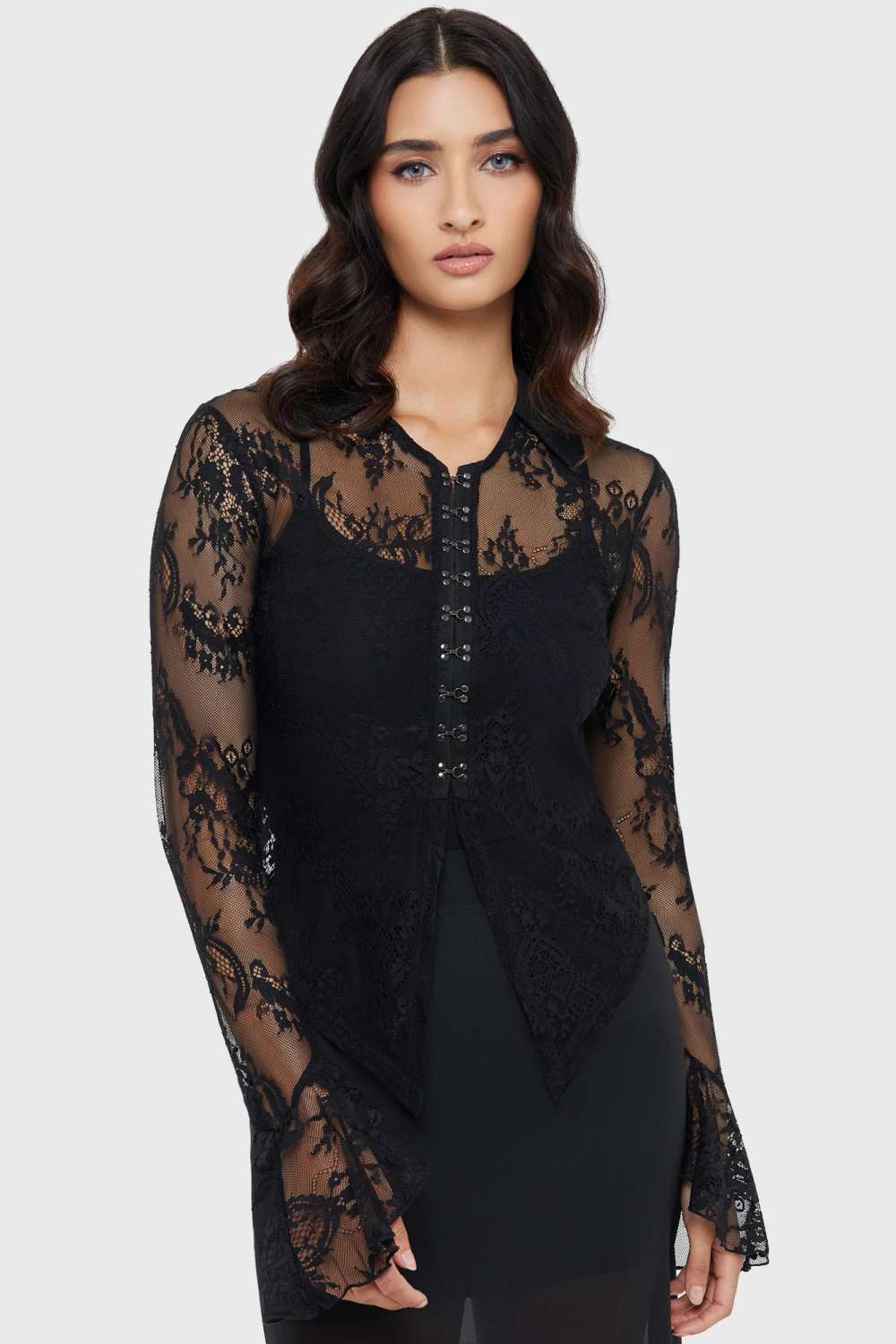 Das Killstar Howling Heart Top besteht aus zarter, dehnbarer Spitze für eine feminine, figurbetonte Silhouette.