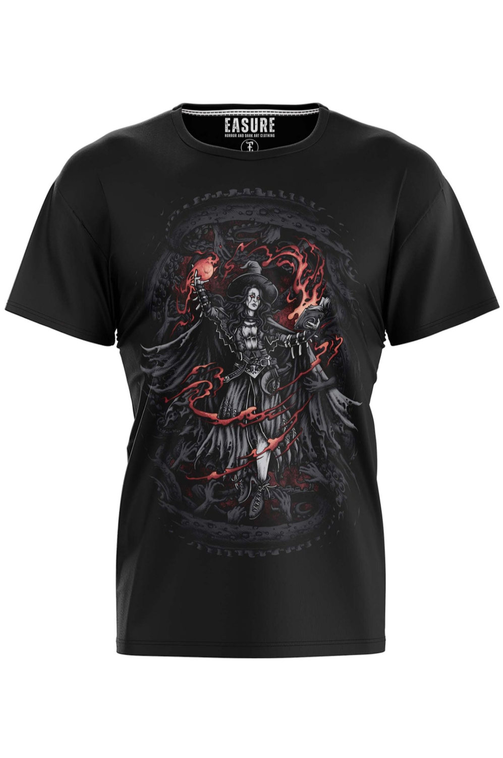 Das Easure Sorceress Shirt zeigt eine eindrucksvolle Hexen‑Szene mit mystischer Symbolkraft, die düstere Magie und Gothic‑Ästhetik vereint.