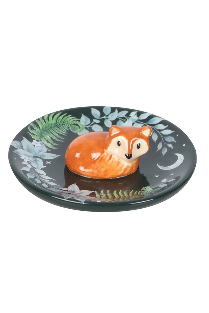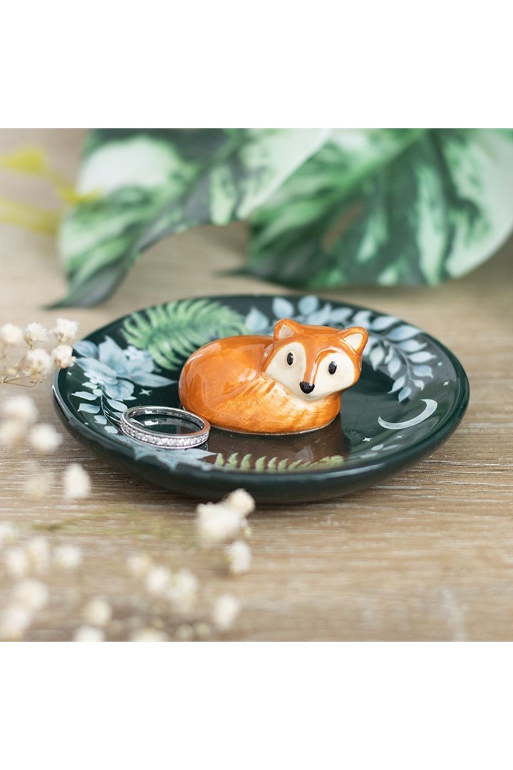 In der Mitte sitzt eine liebevoll gestaltete Fuchsfigur, umgeben von zarten Pflanzenmotiven, die dem Schälchen einen natürlichen, märchenhaften Charme verleihen.
